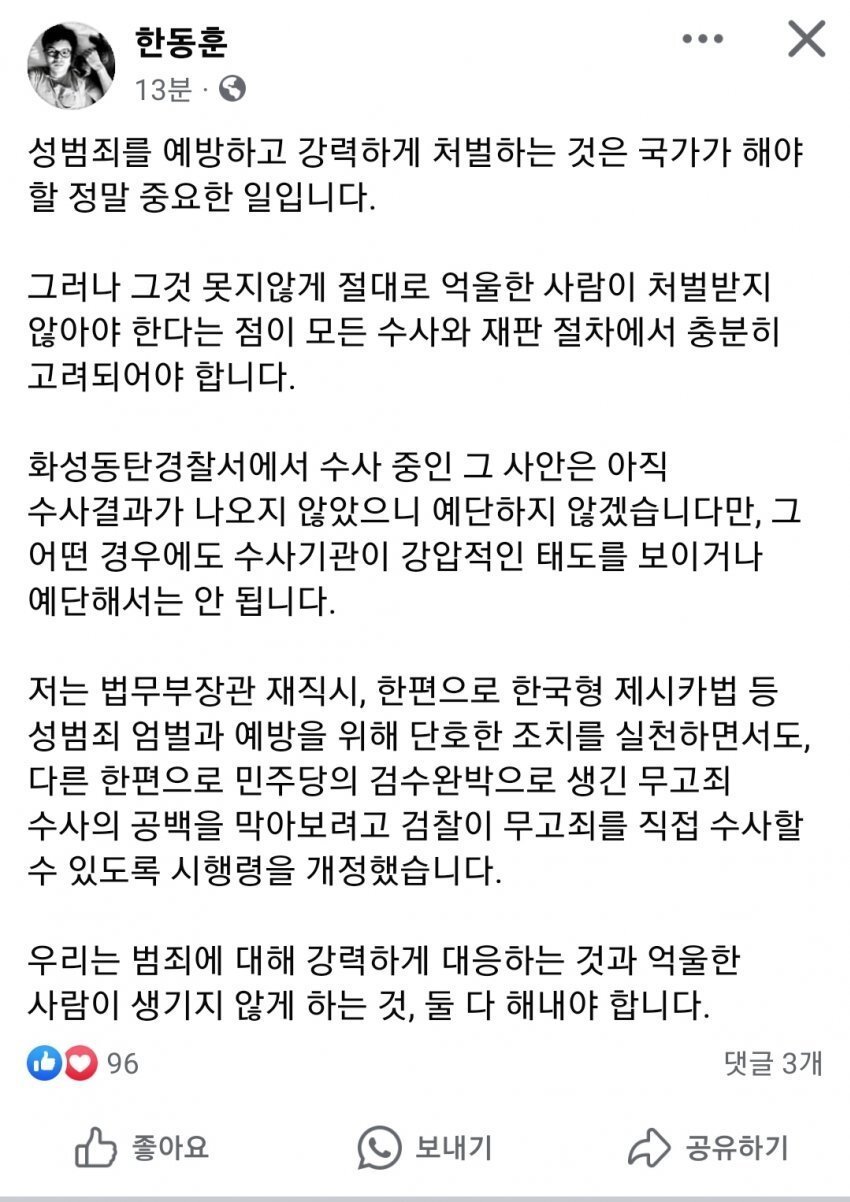 한동훈 동탄 경찰서 관련 페북 내용