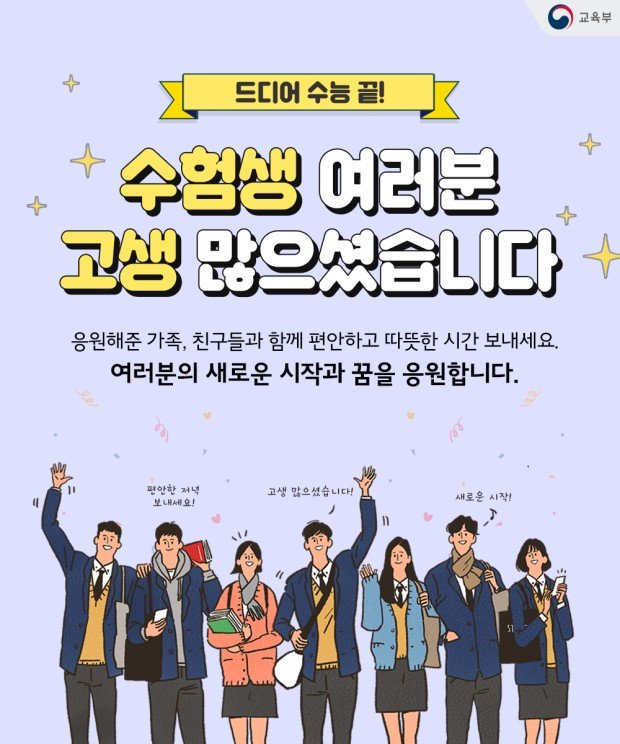그동안 수능 준비 한다고 그동안 고생 많았습니다 어찌보면 수능이 인생이서 가장 중요 해보여도 사회로 나가는 첫 걸음이니깐 아쉽다고 생각하지말고 후회없이 시험보면 그걸로 잘한겁니다 그동안 고생 많이 했습니다 지금부터 즐기세용