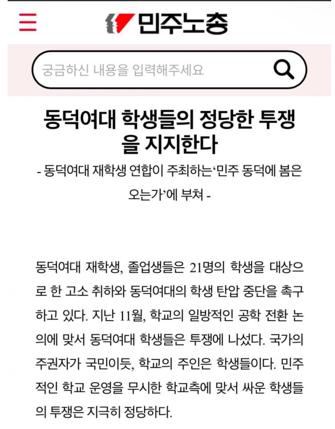 민주노총 “동덕여대 투쟁은 지극히 정당하다”