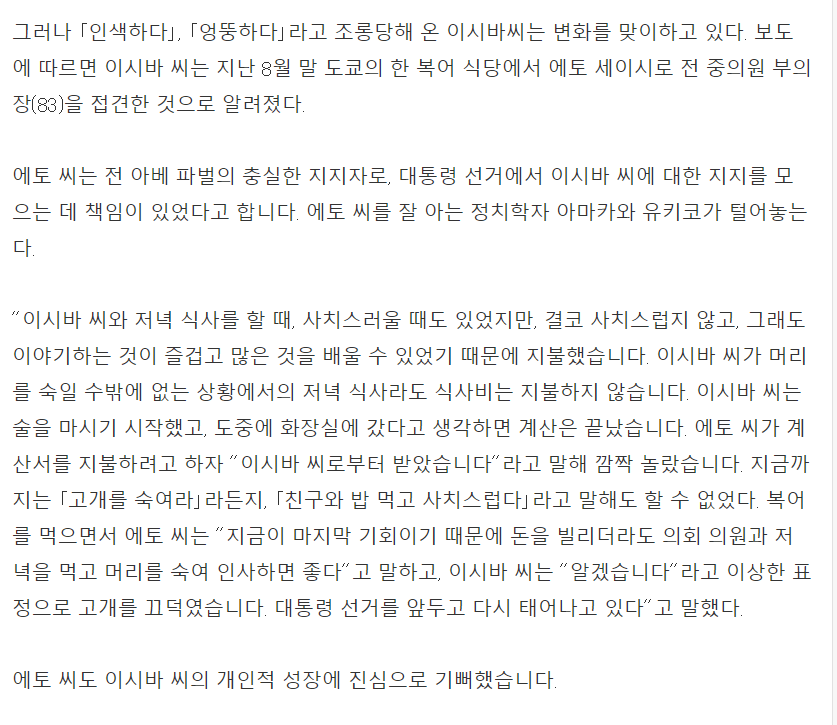 근데 이번에는 이시바가 미리 계산해뒀길래 이 사람이 드디어 변했구나! 하고 지지해줬다는 이야기