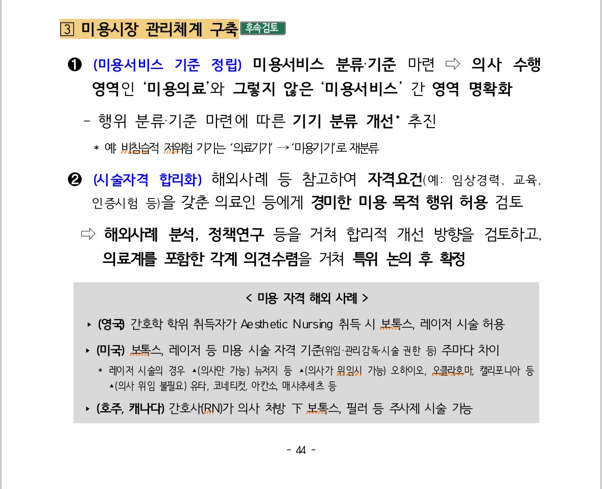 비침습적 저위험 시술은 미용서비스로 분류하고, 의사가 아닌 의료인에게 허용하는 방향으로 검토