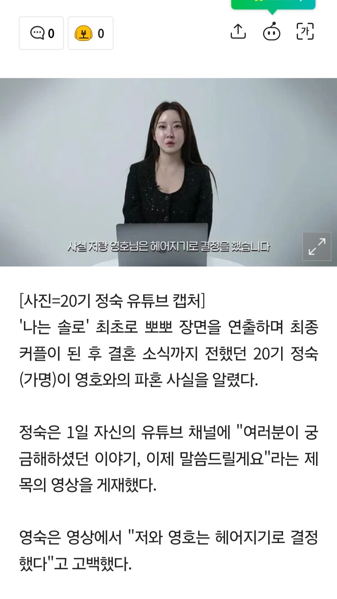 '뽀뽀 커플' 나는 솔로 20기 정숙·영호 결별…"이유 두 가지"