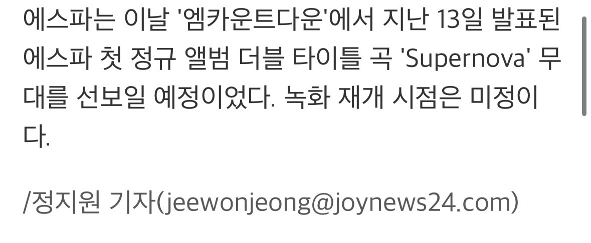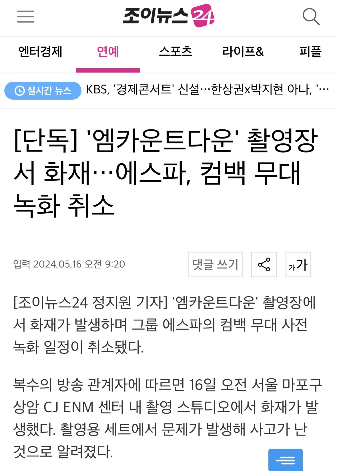 엠카 촬영장 화재로 에스파 컴백 녹화 취소...