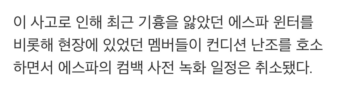 불나고 이후에 최근 기흉 수술받은 윈터가 숨쉬기 어려워져 녹화 미루고 나머지 멤버들이 나와서 사과했다고 함