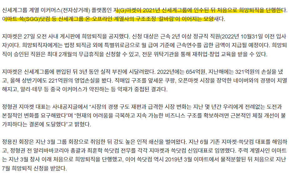 이마트·SSG 이어 G마켓도 희망퇴직…신세계 계열사 ‘칼바람’