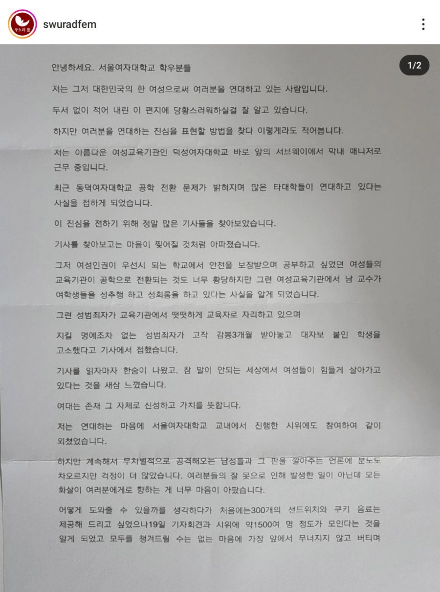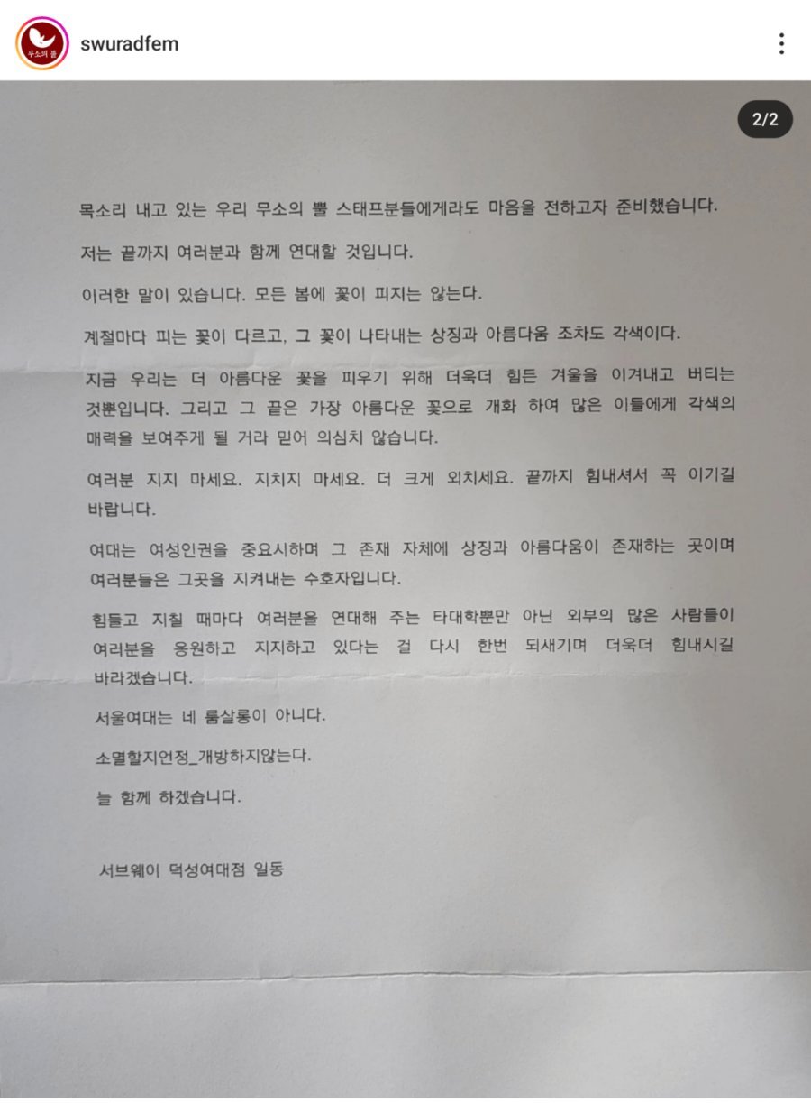 서브웨이 덕성여대점 동덕여대 시위 지지