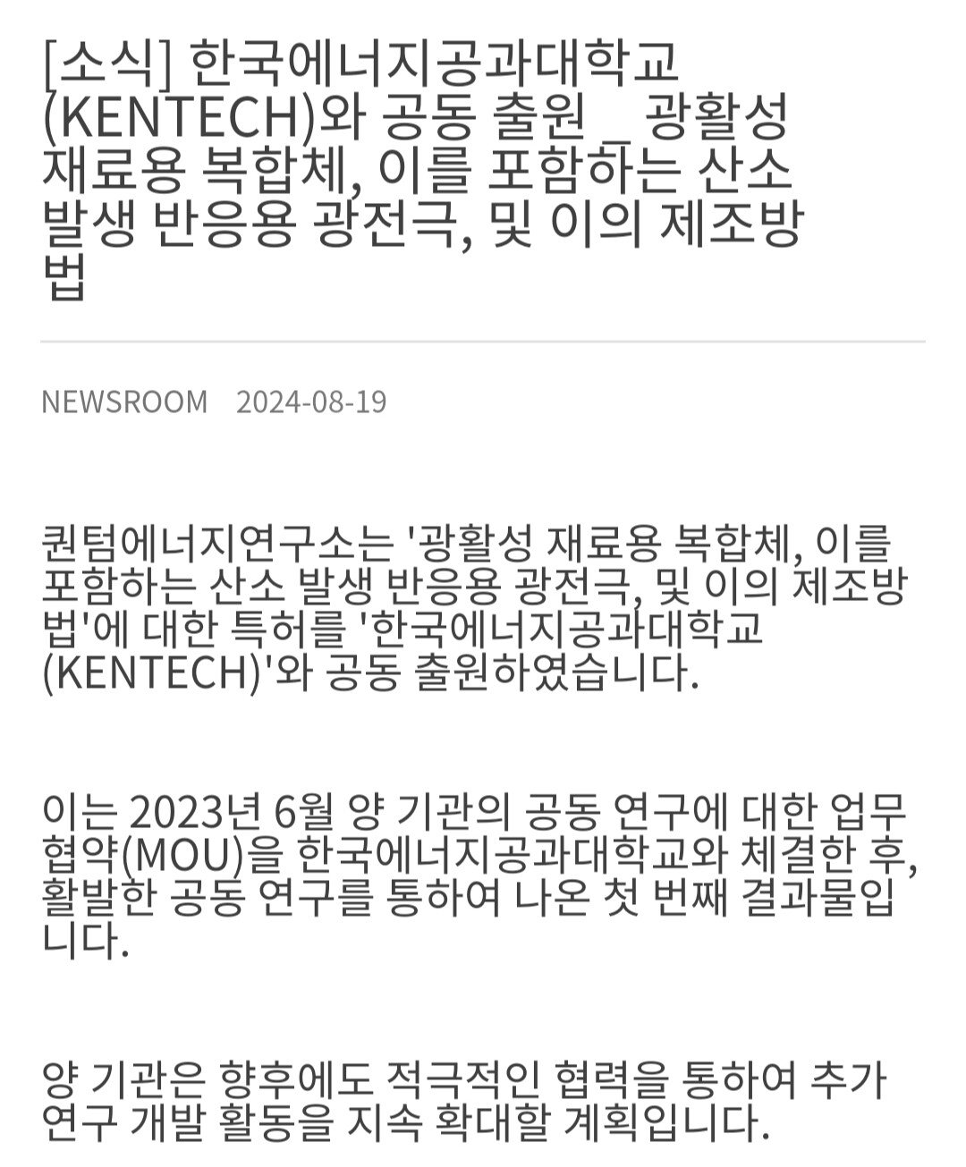 한국에너지공과대학교와 함께 특허 공동 출원함.