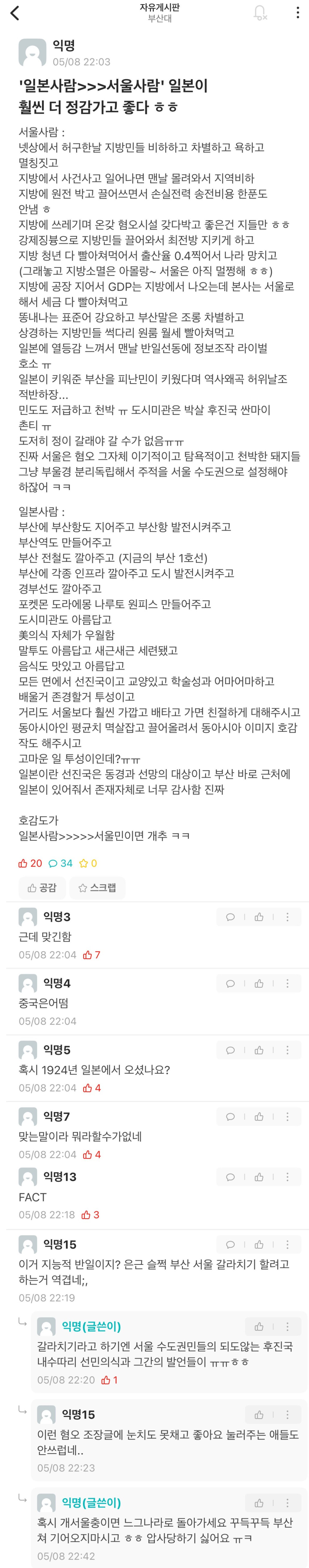 서울사람보다 일본인이 더 좋다는 부산대 에타 ㅎㅎ