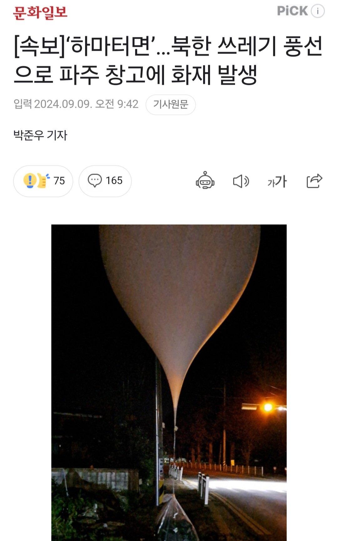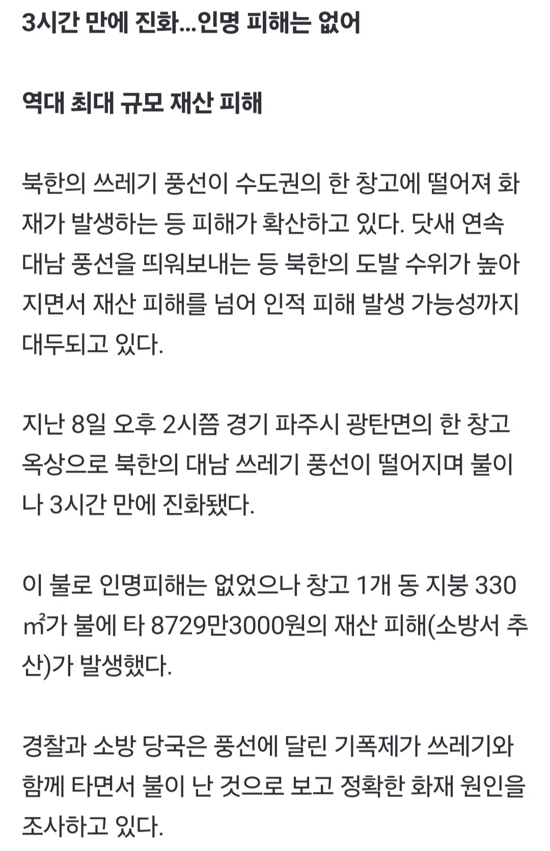 [속보] 북한 오물풍선 때문에 파주 창고에 화재 발생...ㄷㄷㄷㄷㄷ