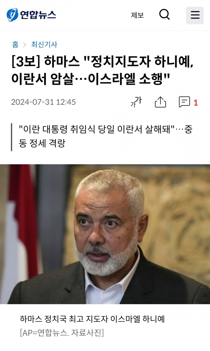 서울=연합뉴스) 김연숙 기자 = 팔레스타인 무장정파 하마스의 정치국 최고 지도자 이스마일 하니예가 이란 수도 테헤란에서 이스라엘의 공격으로 사망했다고 하마스가 31일(현지시간) 밝혔다.