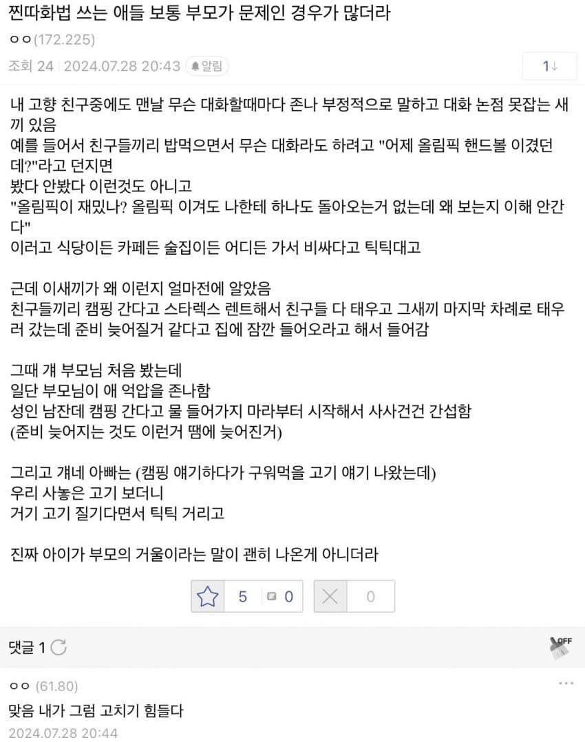 찐따화법 쓰는 애들 보통 부모가 문제인 경우가 많더라