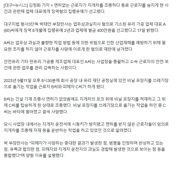 무면허 근로자가 지게차 운전하다 동료 사망…업주 집유