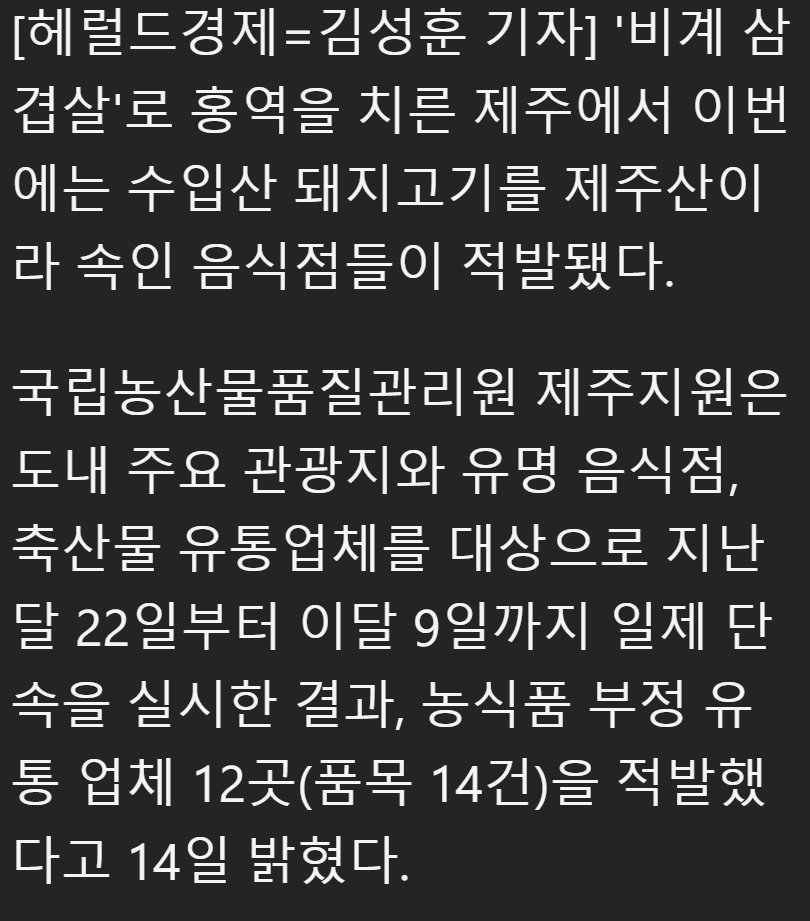 '제주 이번엔 '짝퉁 제주 삼겹살' 걸렸다.'