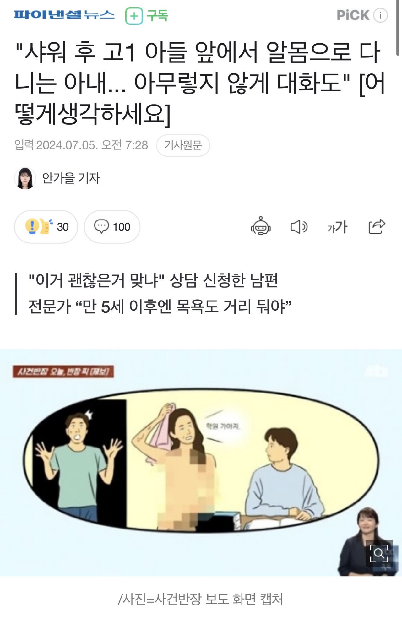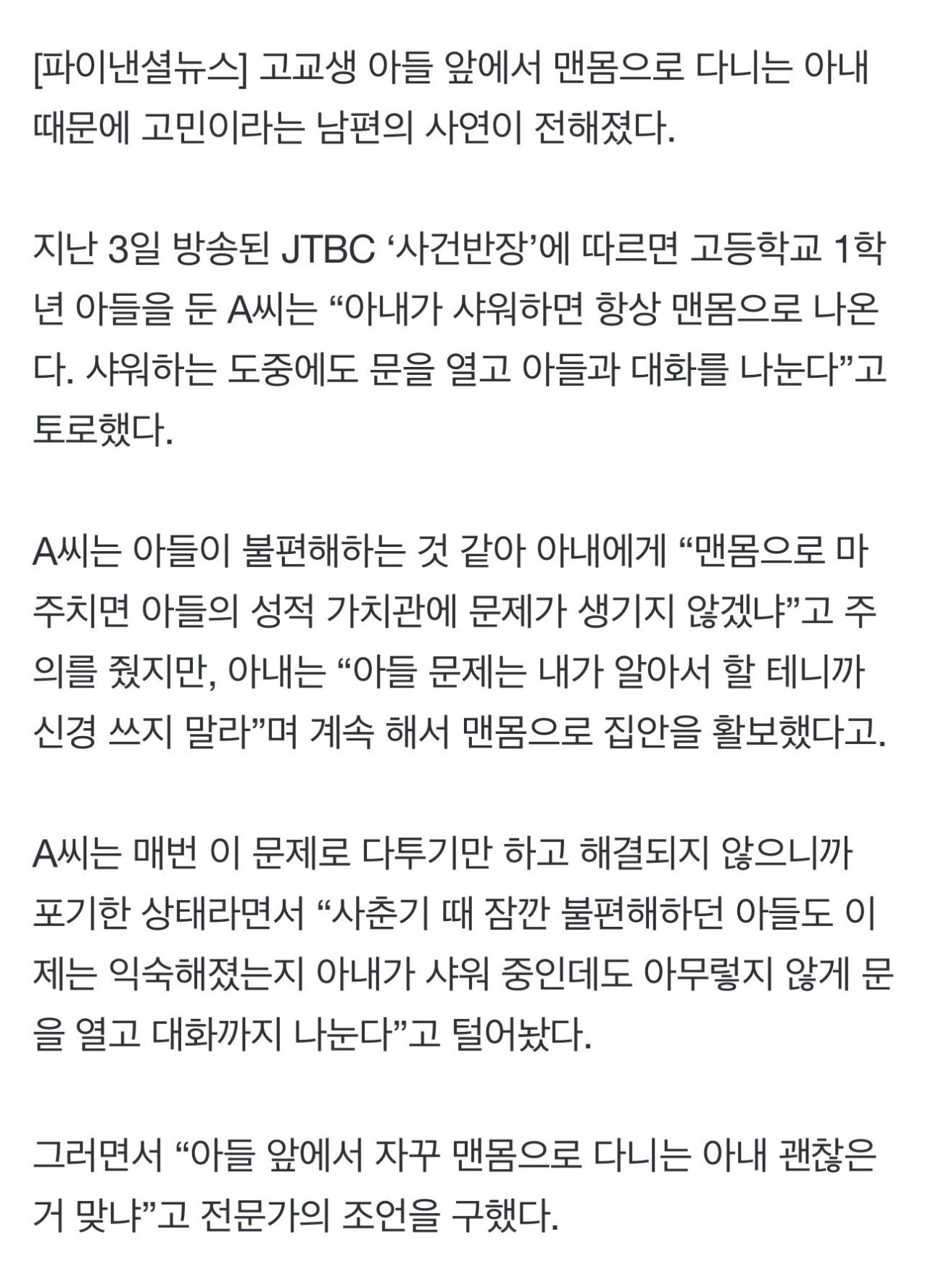 "샤워 후 고1 아들 앞에서 알몸으로 다니는 아내... 아무렇지 않게 대화도"