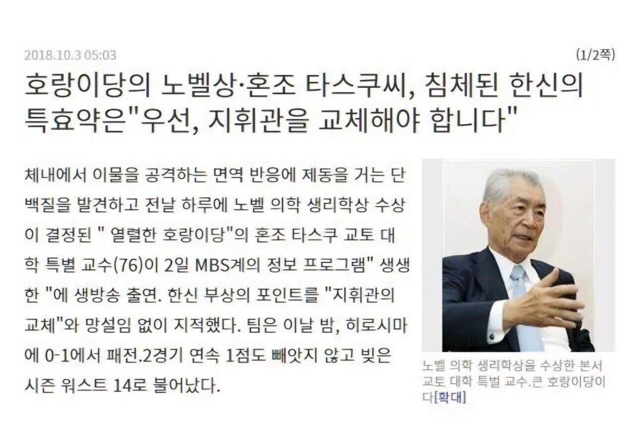 2018년 일본 노벨생리의학상 수상자 혼조 다스쿠