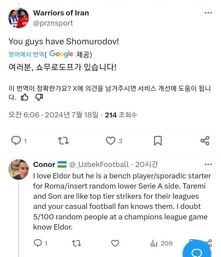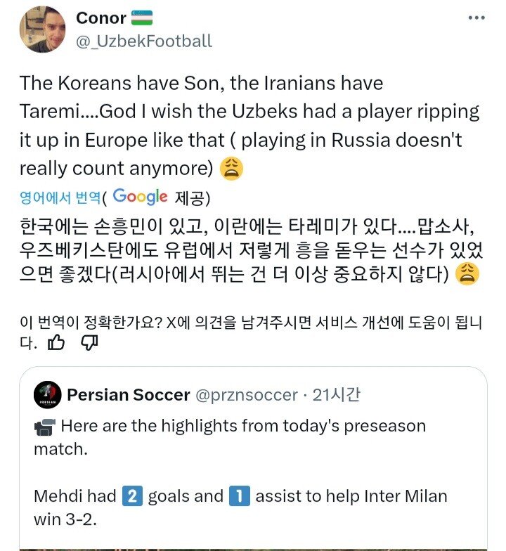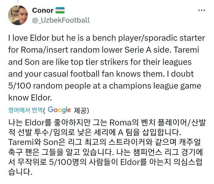 우즈벡에는 저런 대형선수가 없다고 자조하는 우즈벡 축구팬