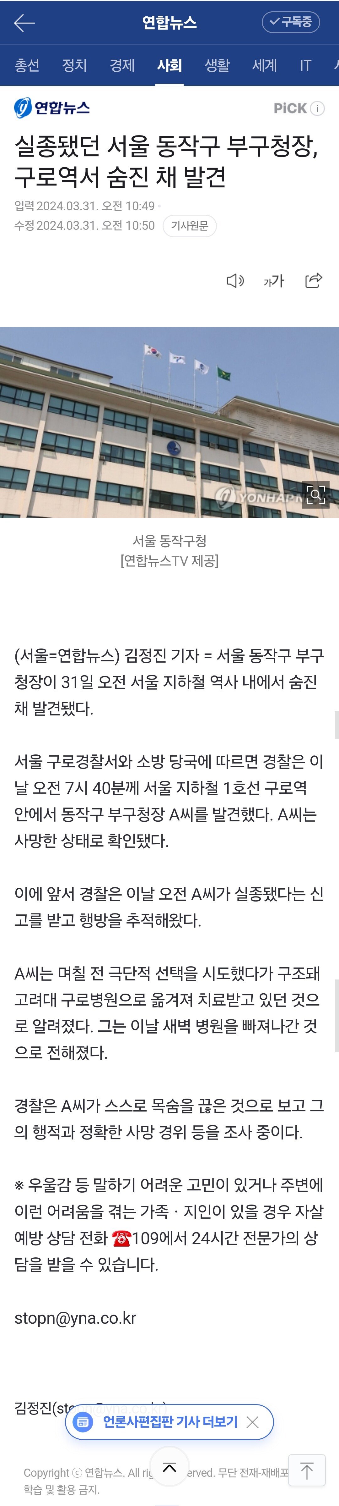 실종됐던 서울 동작구 부구청장 구로역서 숨진 채 발견