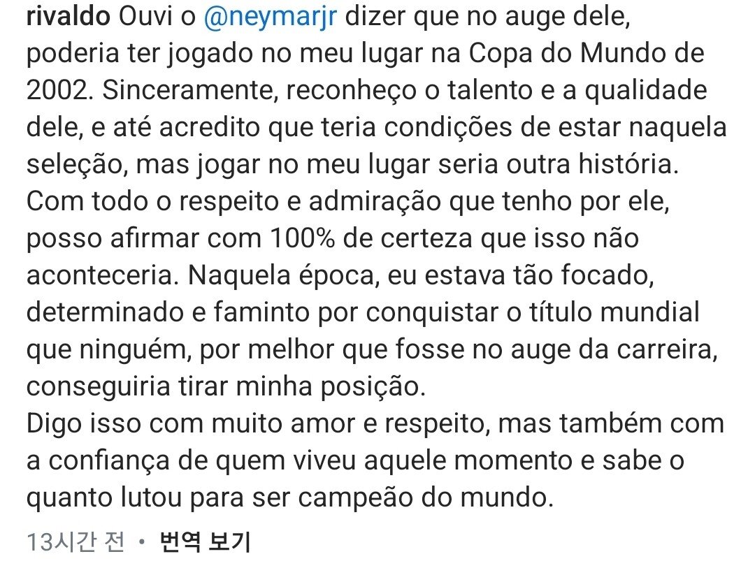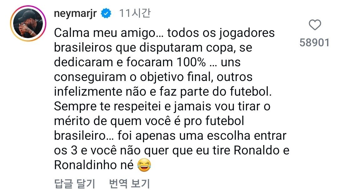 네이마르 : 진정하세요, 친구... 월드컵에 출전했던 모든 브라질 선수들은 100% 헌신하고 집중했습니다. 어떤 선수들은 최종 목표(우승)를 이루었고, 다른 선수들은 안타깝게도 그렇지 못했지만, 그 또한 축구의 일부입니다. 저는 항상 당신을 존중해왔고, 브라질 축구에서 당신이 가진 공로를 결코 폄하하려는 의도가 아니었습니다. 그저 당시 선택의 문제였을 뿐입니다. 그리고 당신도 제가 호나우두와 호나우지뉴를 빼길 원하지는 않을 거잖아요.