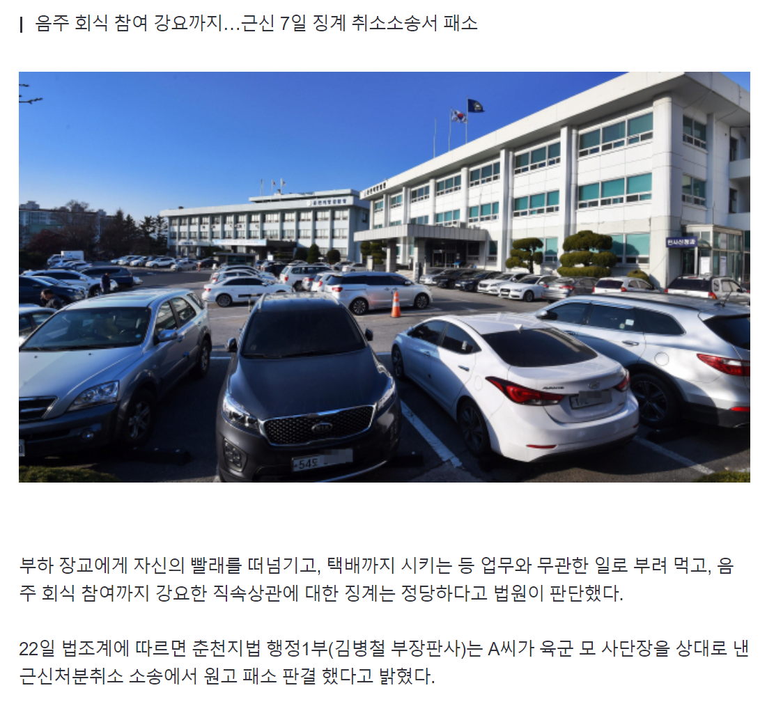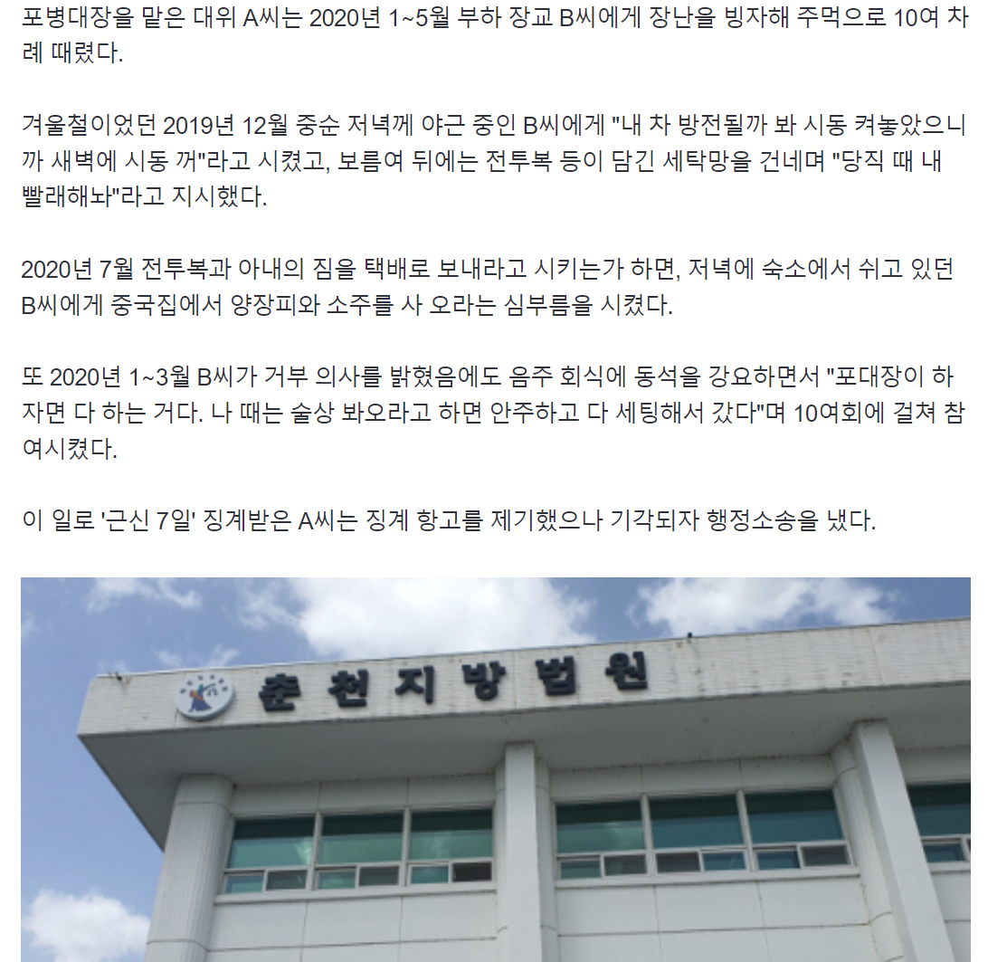 부하 장교에게 빨래 떠넘기고 택배 심부름, 음주 회식 강요까지 한 육군 대위 징계·보직해임