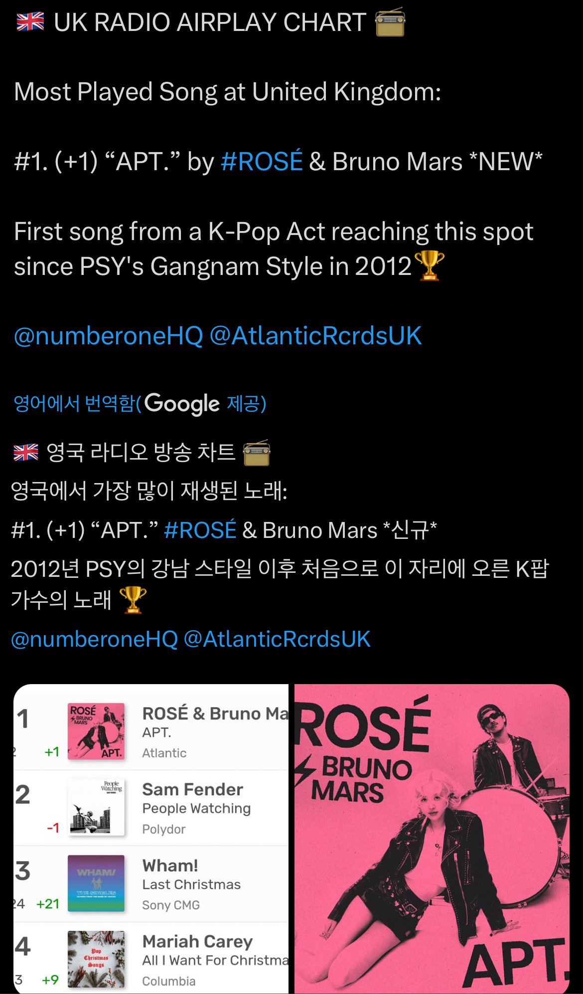 강남스타일 이후 처음으로 영국 라디오 차트 1위한 아파트