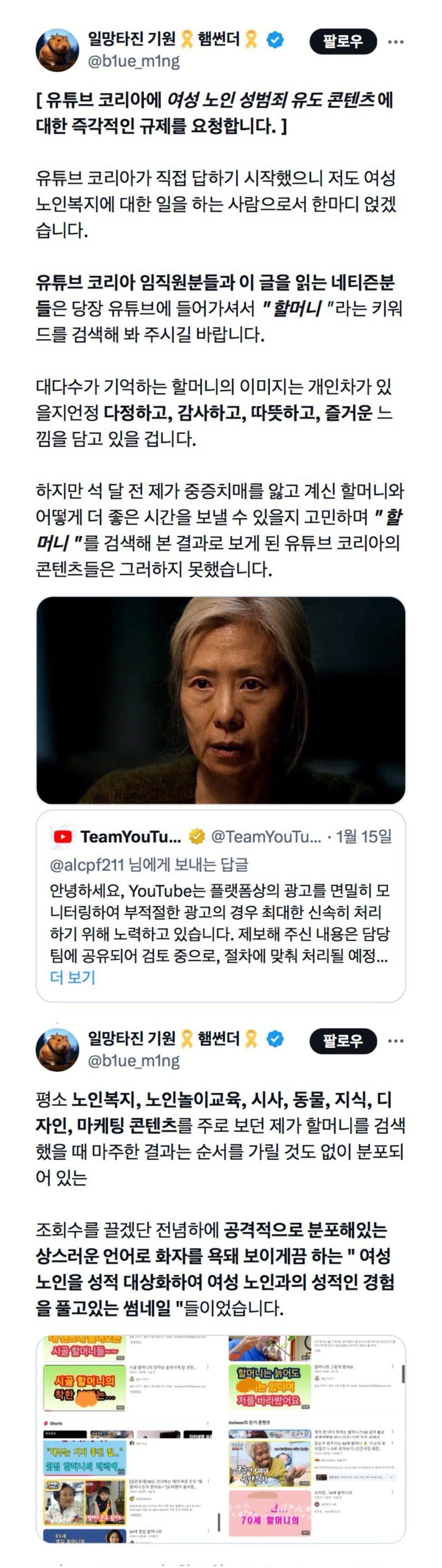 유튜브 코리아에 여성 노인 성범죄 유도 콘텐츠에 대한 즉각적인 규제를 요청합니다
