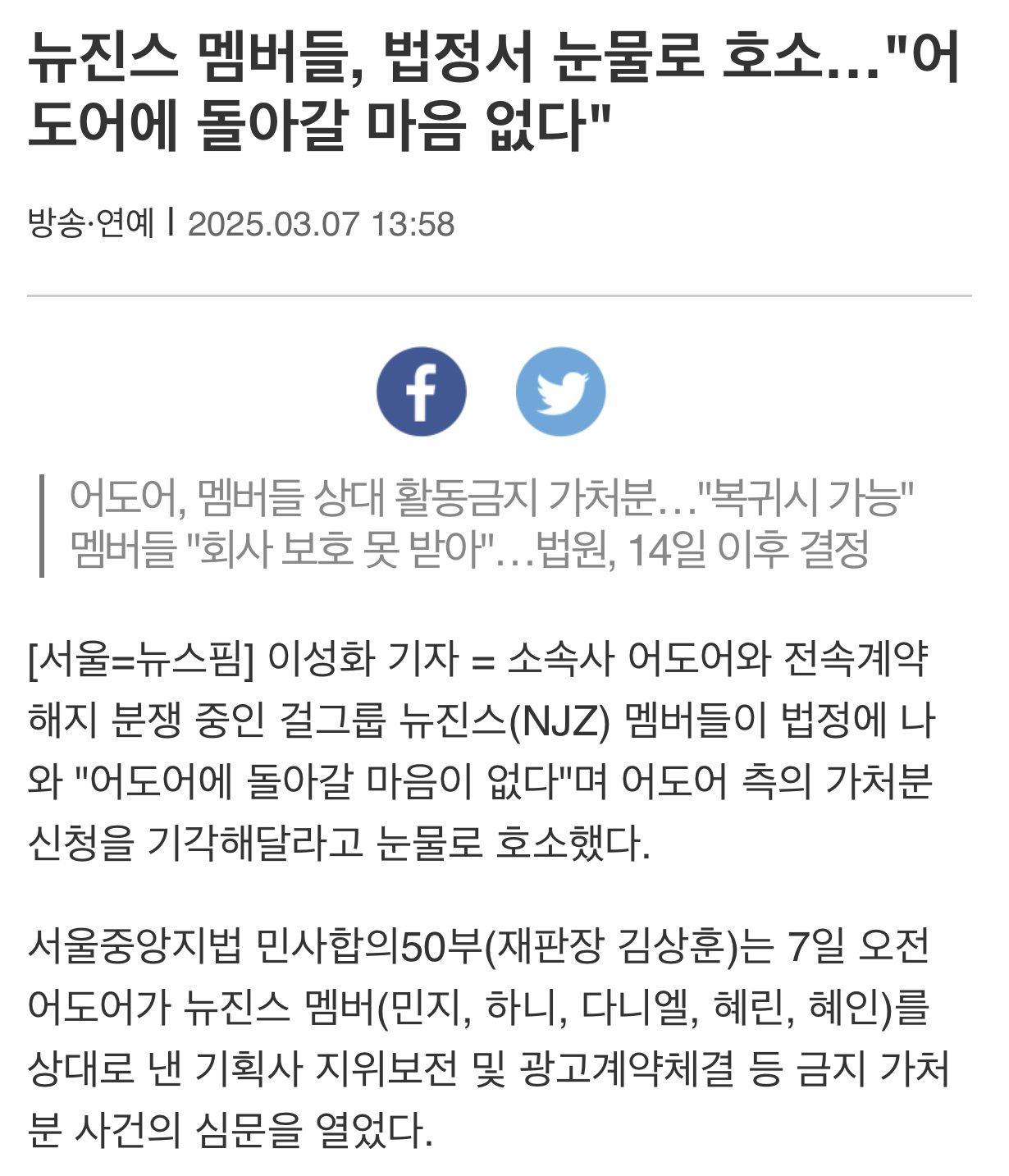 뉴진스 멤버들, 어도어에 돌아갈 싶은 마음 없다