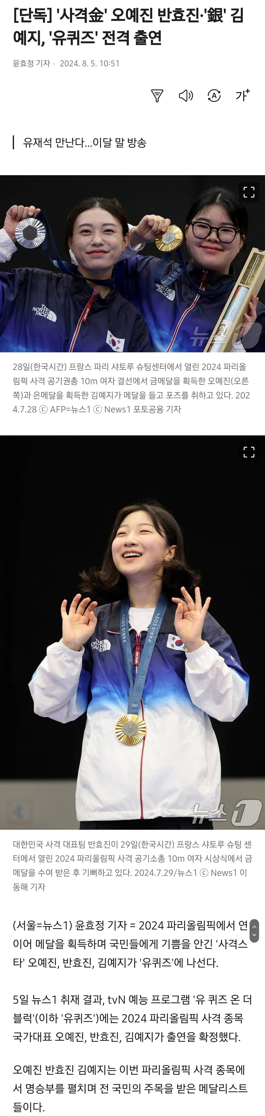 [단독] '사격金' 오예진 반효진·'銀' 김예지, '유퀴즈' 전격 출연