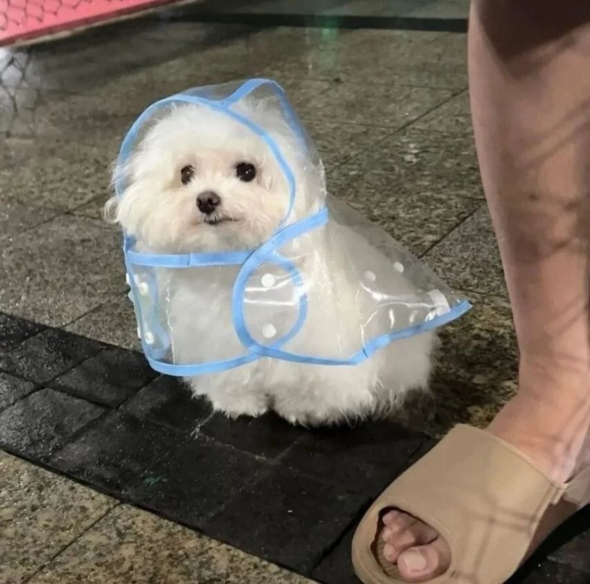 산책용 비옷입은 강아지