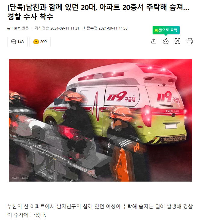[단독]남친과 함께 있던 20대, 아파트 20층서 추락해 숨져…경찰 수사 착수