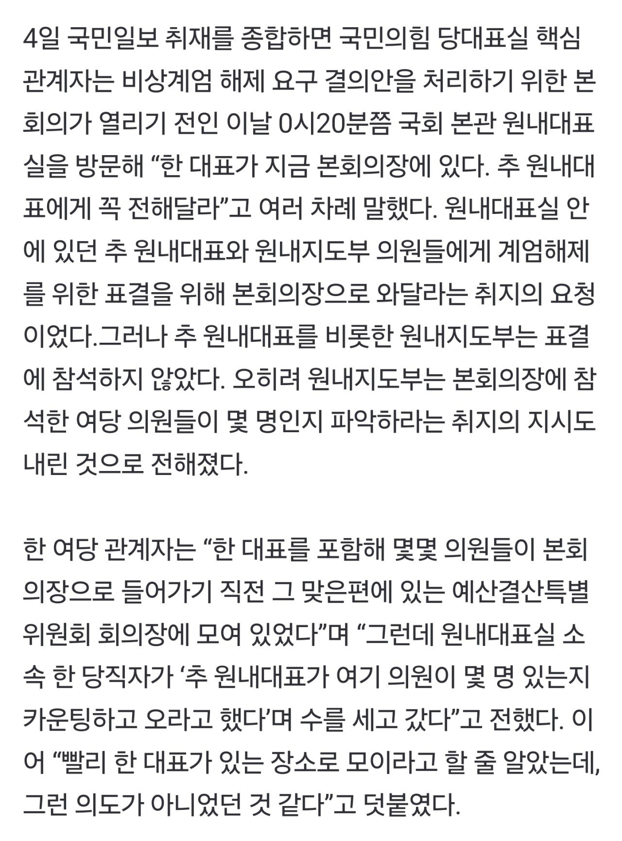 추 원내대표를 비롯한 원내지도부는 표결에 참석하지 않았다. 오히려 원내지도부는 본회의장에 참석한 여당 의원들이 몇 명인지 파악하라는 취지의 지시도 내린 것으로 전해졌다.