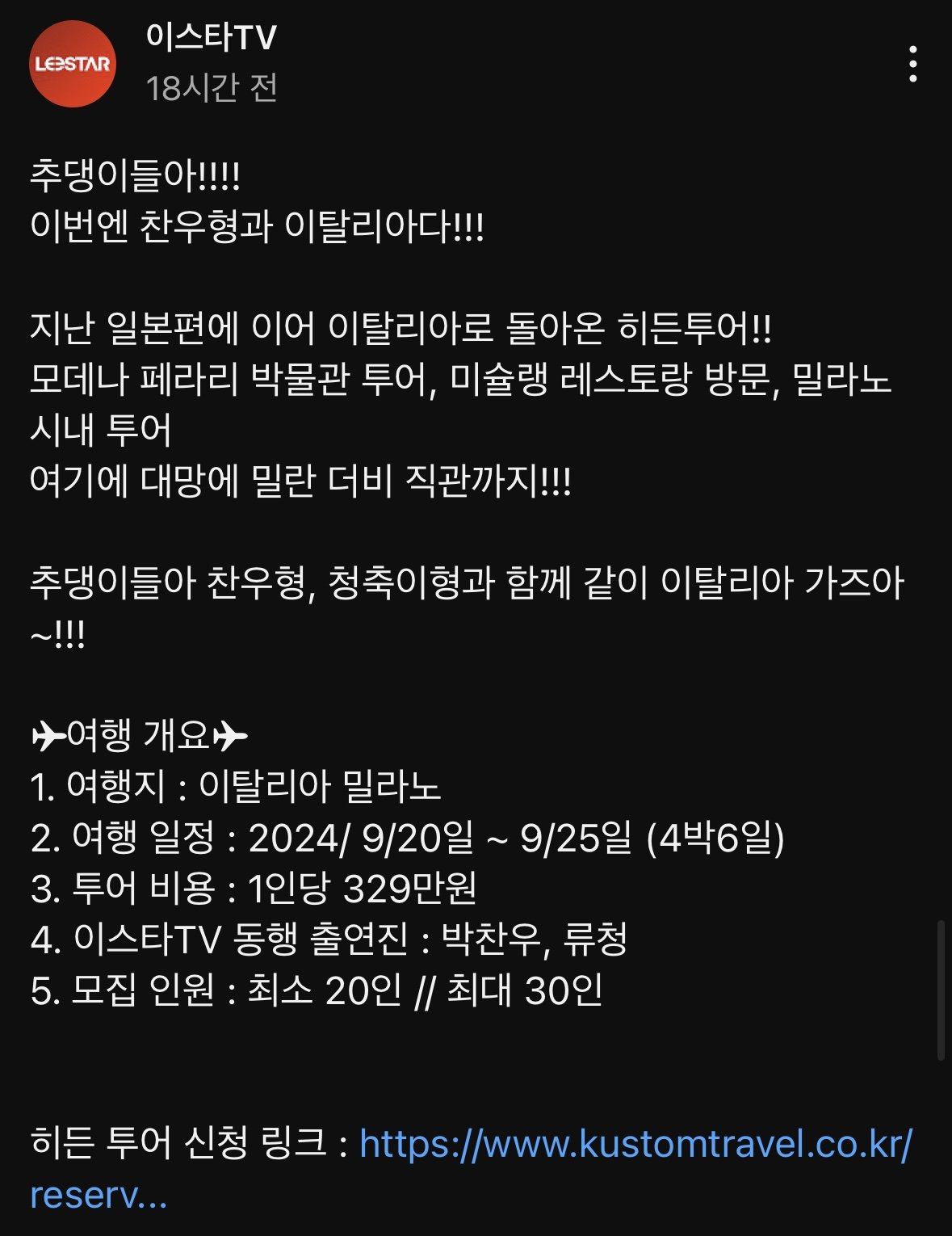 어제자 이스타에서 이탈리아 밀라노 투어 모집 공지를 했는데, 2주전 공지 + 높은 가격으로 현재 댓글 민심 안좋은 상태.