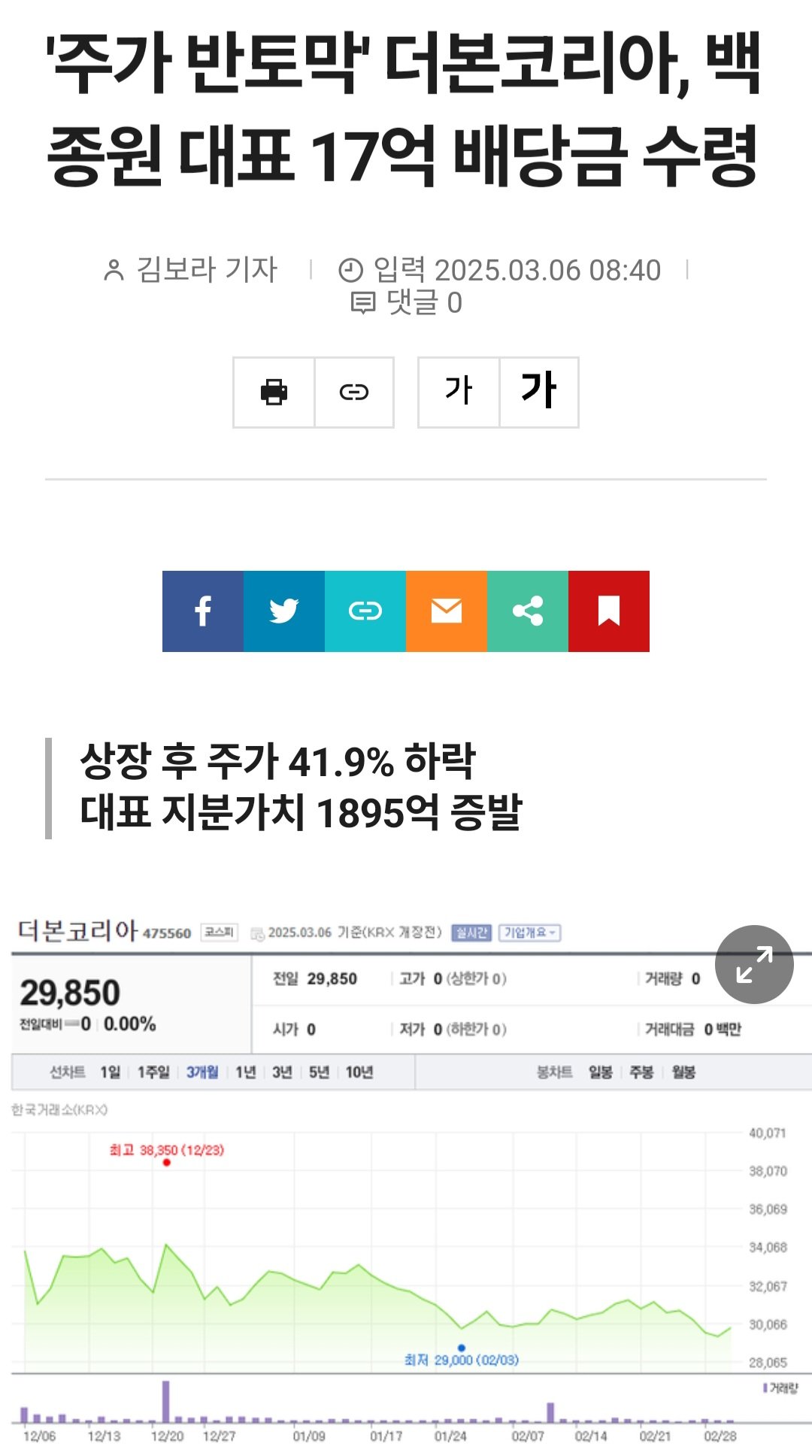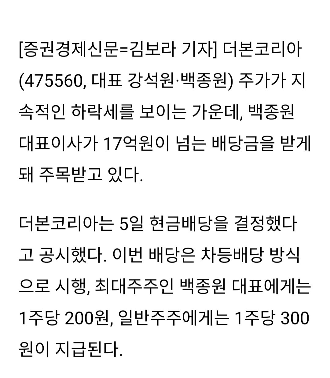 더 본 코리아 백종원 대표 배당금 17억 수령