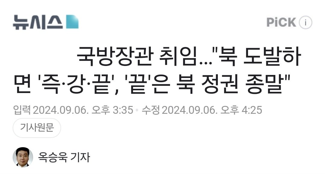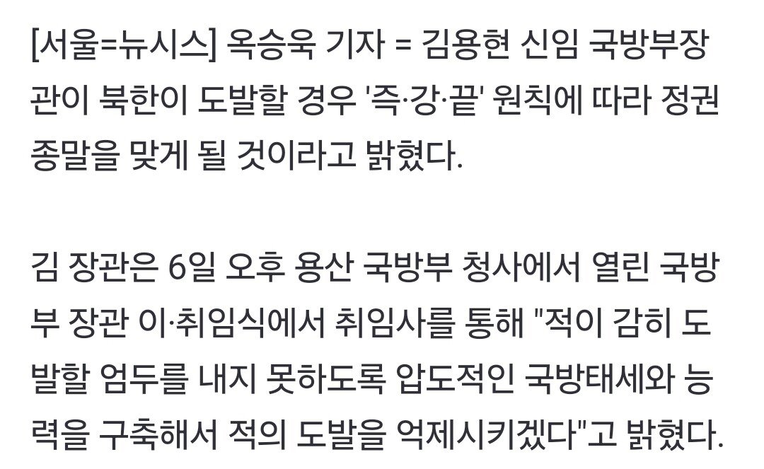 국방장관, "북 도발하면 '즉·강·끝', '끝'은 북 정권 종말"