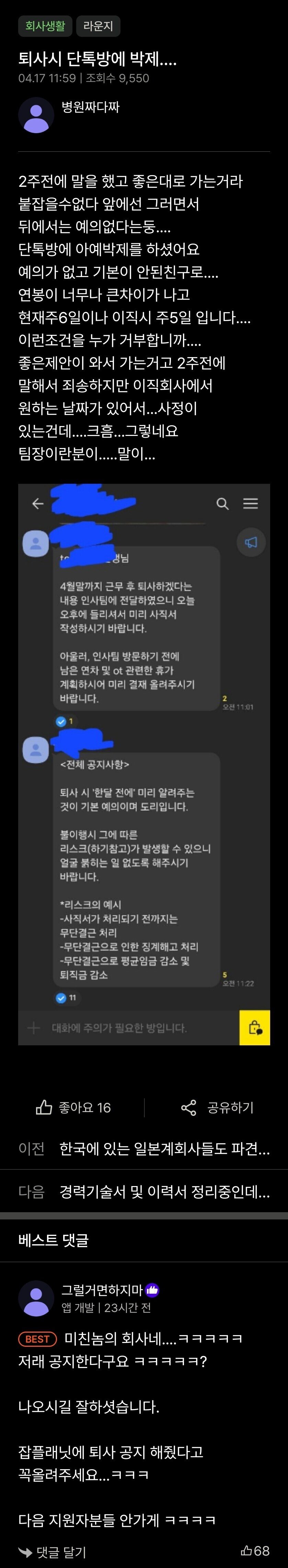 퇴사 2주전에 말했다고 ㅈㄴ 꼽주는 회사