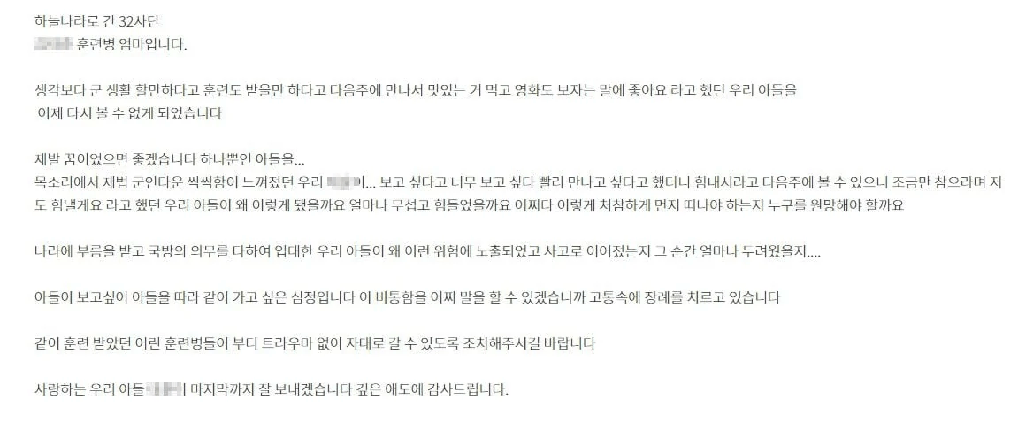 그러면서 “나라에 부름을 받고 국방의 의무를 다하여 입대한 우리 아들이 왜 이런 위험에 노출되었고 사고로 이어졌을까. 그 순간 얼마나 두려웠을지”라며 “아들이 보고 싶어 아들을 따라 같이 가고 싶은 심정이다. 이 비통함을 어찌 말을 할 수 있을까. 고통 속에 장례를 치르고 있다”고 했다.