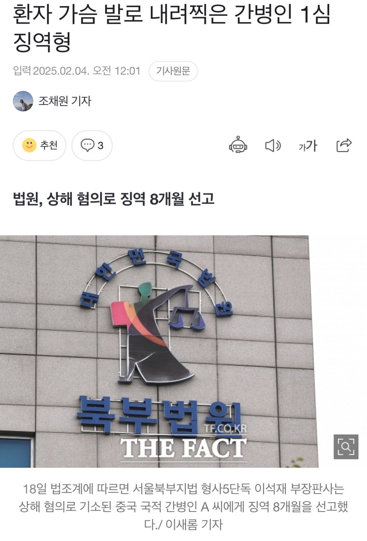 3일 법조계에 따르면 서울북부지법 형사5단독 이석재 부장판사는 상해 혐의로 기소된 중국 국적 간병인 A 씨에게 징역 8개월을 선고했다.