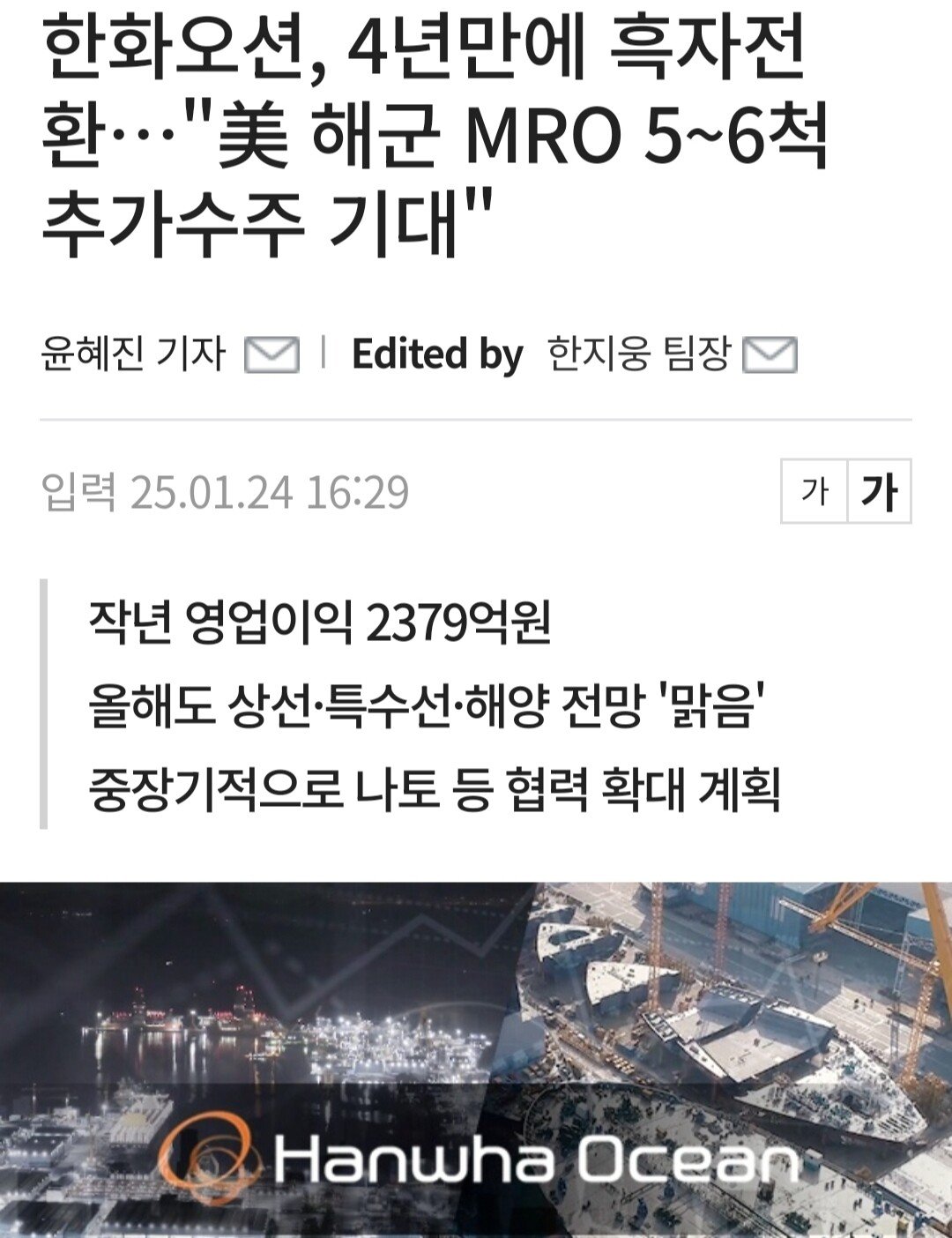 한화오션 "미국, 나토 해군까지 협력 확대 추진"