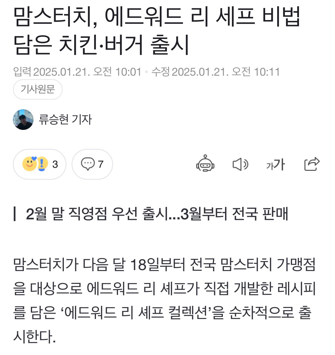 맘스터치, 에드워드 리 세프전용 비법 치킨,버거 출시예정 ㅎㄷㄷ