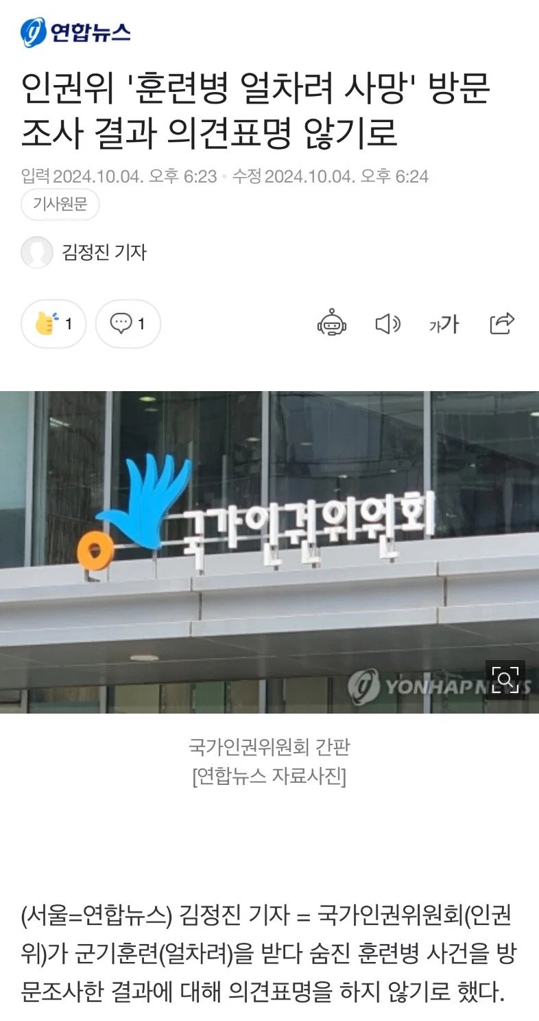 인권위 관계자는 "조사 결과에 대한 의견표명은 통상적 절차"라며 "조사를 마친 사건에 대해 의견표명을 하지 않는 것은 이례적"이라고 설명했다.