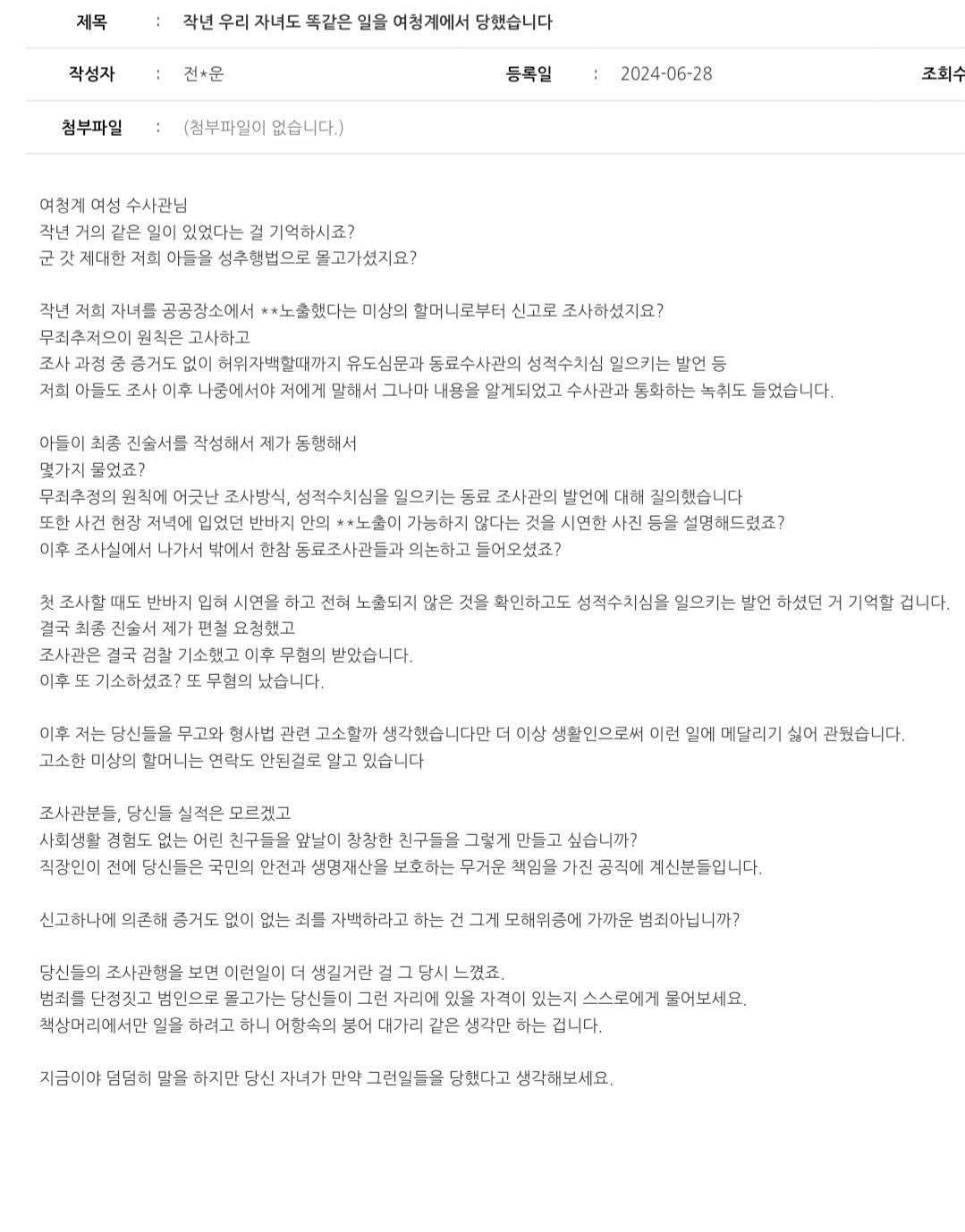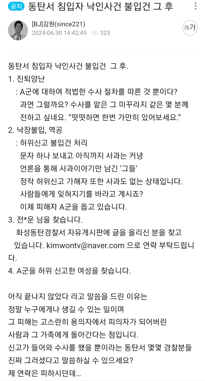 [ 김원 공지 ] 동탄서 침입자 낙인사건 불입건 그 후