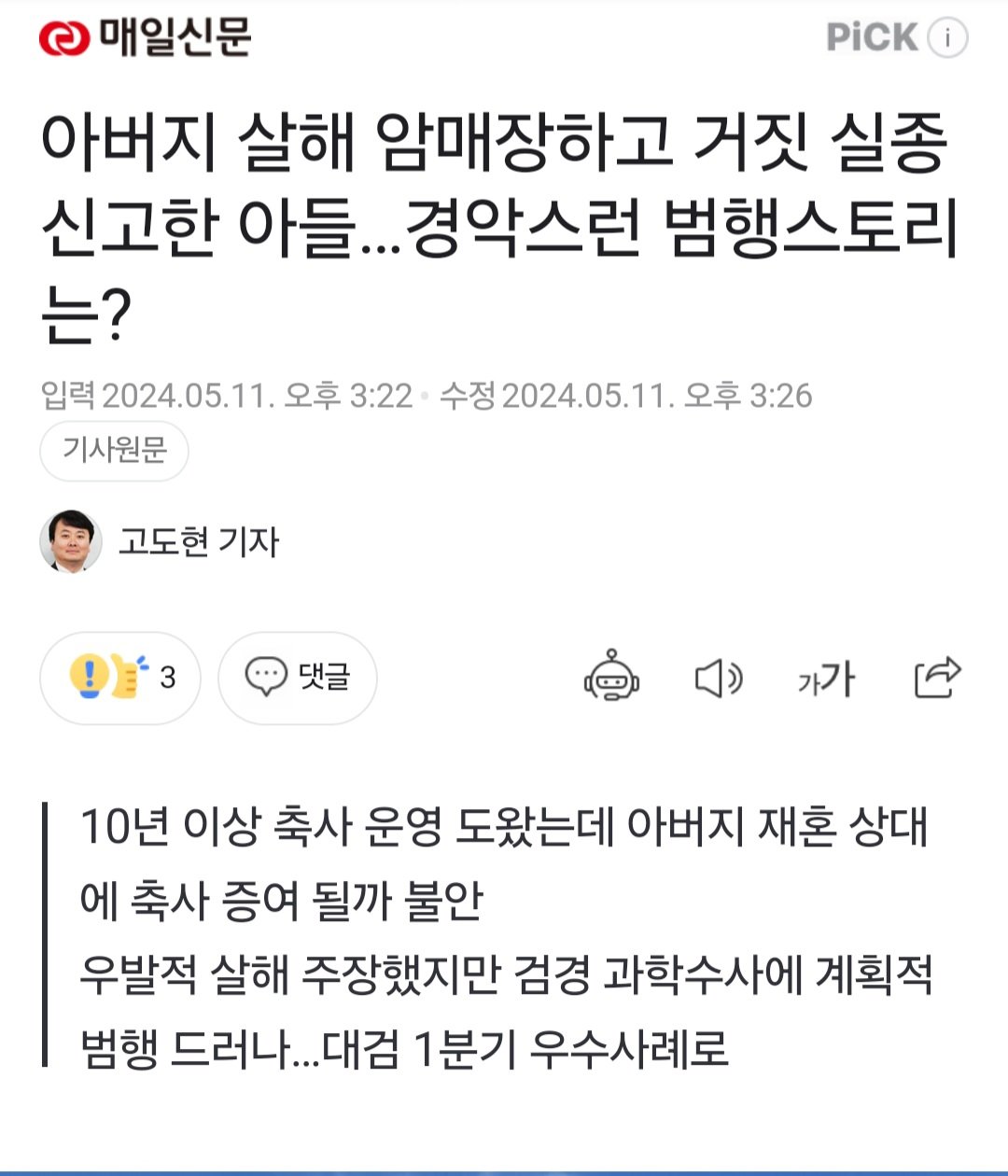 아버지를 둔기로 마구 때려 살해한 뒤 야산에 암매장하고 태연하게 거짓 실종신고를 한 30대 남성(매일신문 2023년 11월10일 보도)이 법원으로부터 무기징역을 선고 받았다.