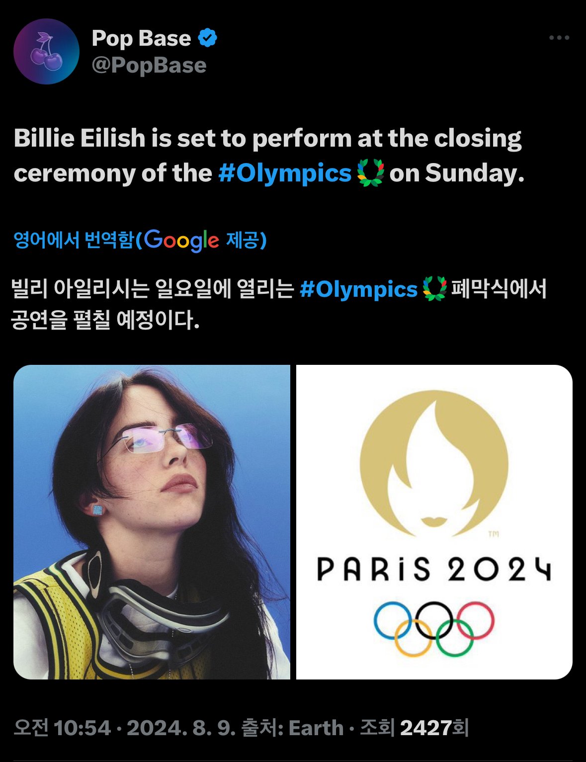 파리올림픽 폐막식 공연은 빌리 아일리시