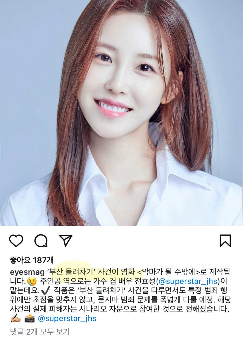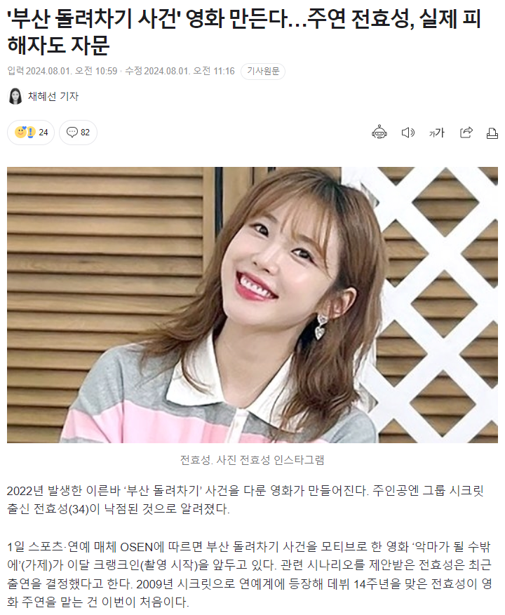 1일 OSEN 취재 결과, 2년 전 벌어진 부산 돌려차기 사건을 모티브로 한 영화 '악마가 될 수밖에'(감독 임용재, 제작사 반딧불)가 프리 프로덕션 과정을 마치고 촬영을 앞두고 있다. 이 영화의 주인공은 걸그룹 출신 배우 전효성으로, 시나리오를 제안 받고 최근 출연하기로 결정했다고.