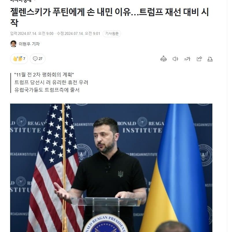 11월 대선이전에 이전처럼 평화회의 개최한다고 기사에 나와있고 기사 어디에도 휴전 협상이라는 말이 없음 블롬버그 통신도 최근 소식통의 말은 인용했다고 나왔지 우크라이나 정부의 공식적인 반응은 아님