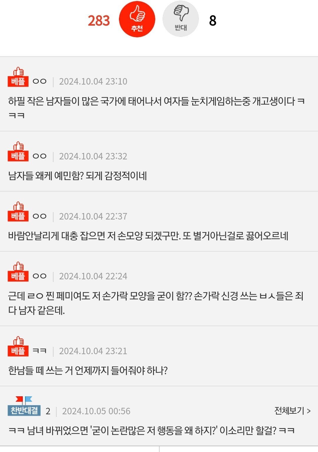 응 찐페미들이 그 손가락 원베놀이를 계속 하더라고ㅋㅋ
