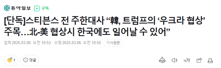[단독]스티븐스 전 주한대사 “韓, 트럼프의 ‘우크라 협상’ 주목…北-美 협상시 한국에도 일어날 수 있어”