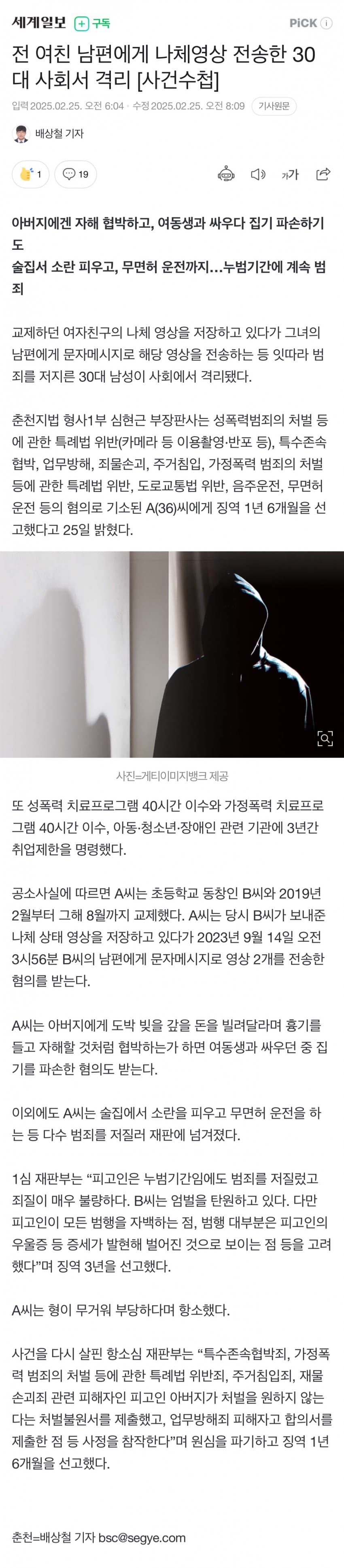 전 여친 남편에게 나체영상 전송한 30대 사회서 격리