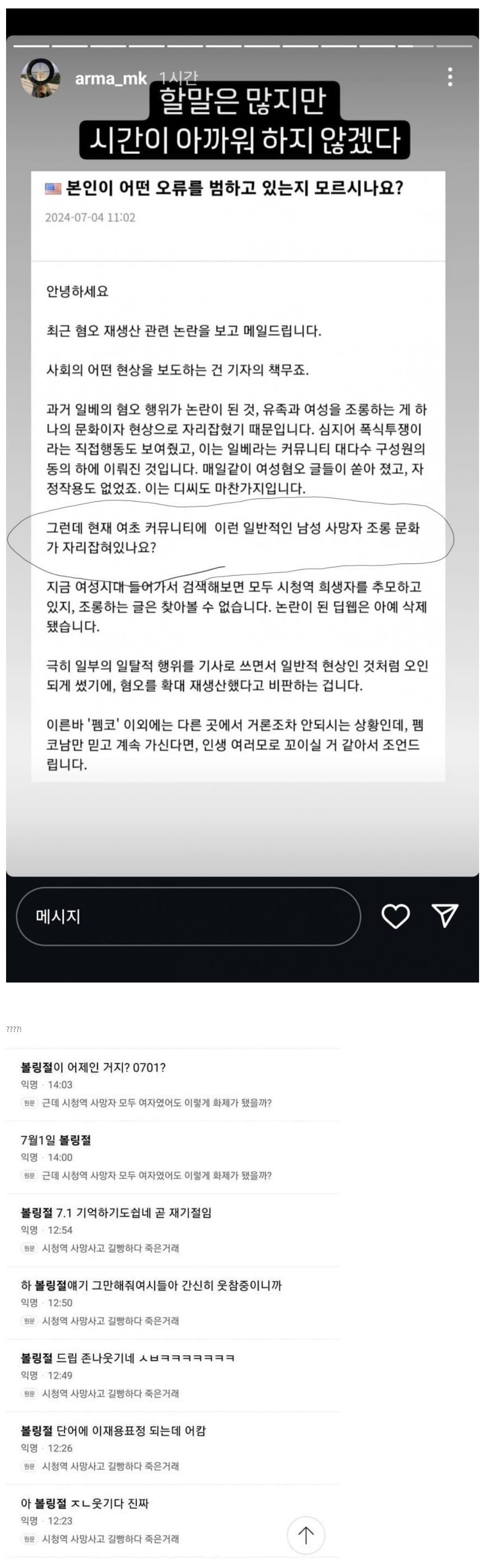 "여초는 남성 사망자를 조롱하지않는다구요!!"