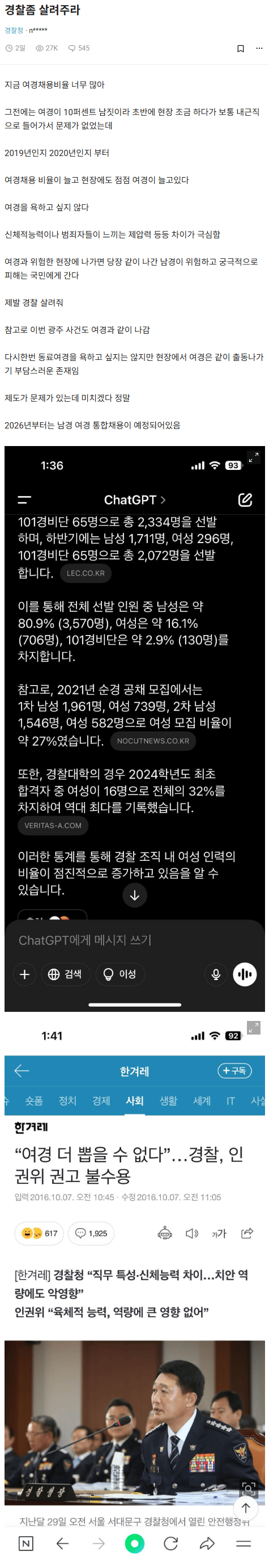 블라) 여경 때문에 경찰좀 살려다는 경찰청 직원