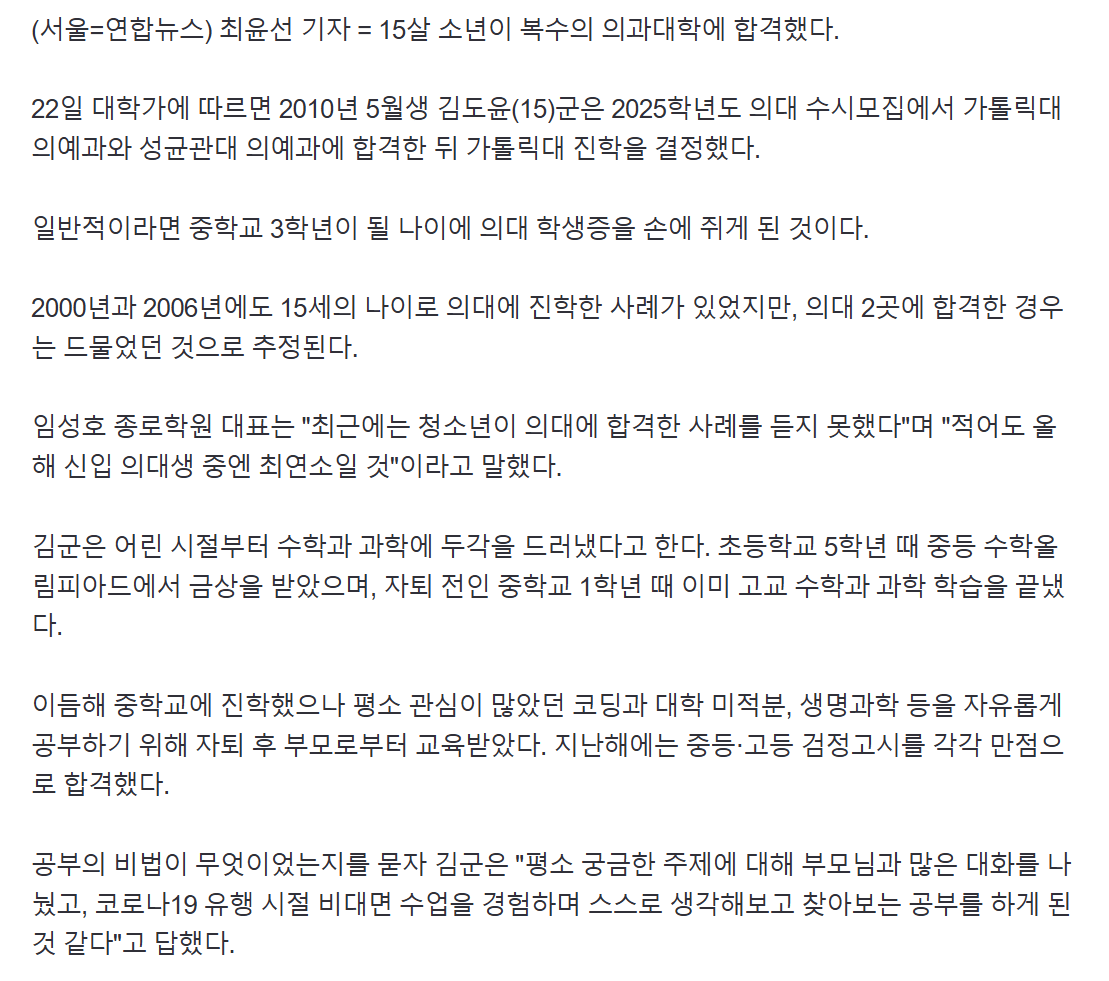 '최연소' 15살 의대생 탄생…"의과학자 되고파"
